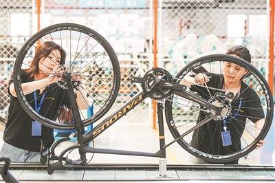 位于山東樂陵經濟開發區的泰山體育產業集團為巴黎奧運會的摔跤、自行車、跆拳道、體操、田徑等比賽提供器材。圖為工人在組裝碳纖維自行車。新華社記者 朱崢 攝?