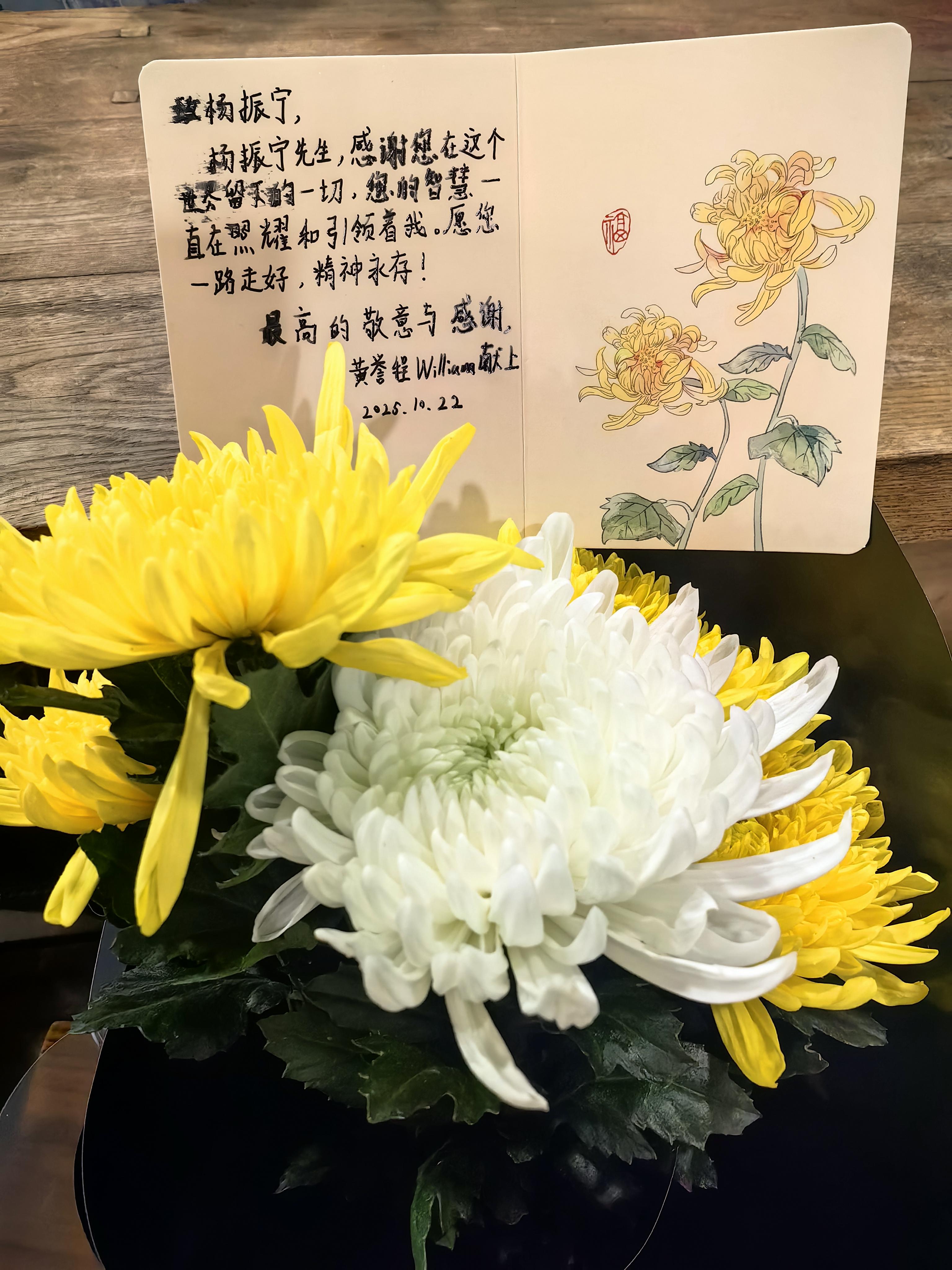 黃譽程又買了兩束花。一束代朋友送,一束為自己送。他在卡片上寫道:“感謝您在這個世界留下的一切,您的智慧一直在照耀和引領著我。愿您一路走好,精神永存!”