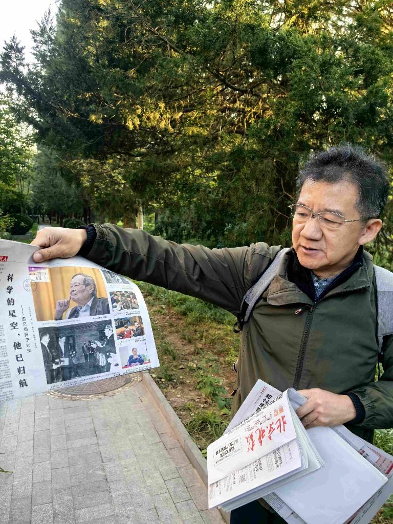 中國報業協會集報分會的兩位會員背著大包來了,他們帶上了9份10月19日刊登楊振寧去世相關報道的報紙。他們說,楊先生雖然離去了,但他已經鼓舞了一代又一代年輕人。