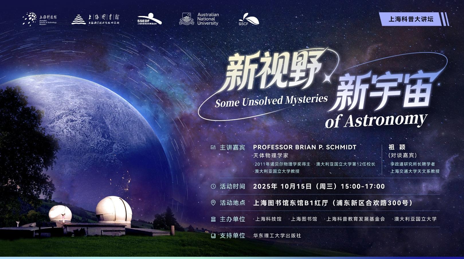 ?2011年諾?爾物理學獎獲得者、澳?利亞國立大學第12任校長、天體物理學家布萊恩·施密特(Professor Brian P. Schmidt)教授將做客上海科普大講壇,介紹天文觀測取得的最新成果以及那些我們尚且無法理解的天文學問題。圓桌對談中,李政道研究所長聘學者、上海交通大學天文系教授祖穎也將帶來新觀點。10月15日15:00,讓我們共赴這場星空之約。